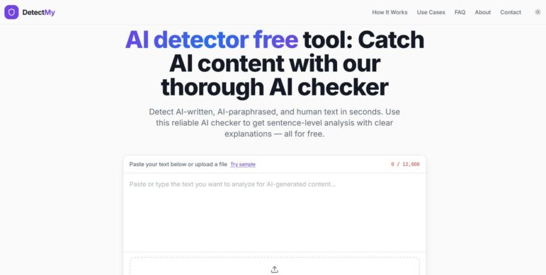 DetectMy.ai is built for users who want more than one overall score. The tool supports pasted text plus file uploads such as TXT, PDF, and DOCX up to 10 MB. DetectMy.ai offers sentence-by-sentence analysis, mixed-content detection, and guidance that longer texts usually produce better results.