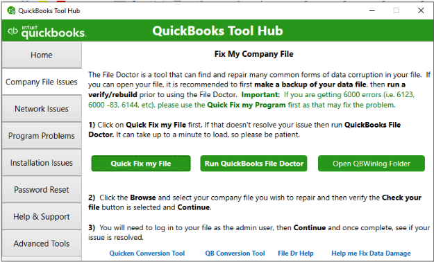Creating the backup file means you are creating a copy of the company file. If the QuickBooks company file is corrupted, it can lead to the QuickBooks backup file is not working issue. In this case, you can use the QuickBooks’ Verify and Rebuild Data tool to rebuild the company file data. It may not fix the severely corrupted company file. In such a case, you can download QuickBooks Tool Hub to repair the QBW file. Here are the steps to do so:
