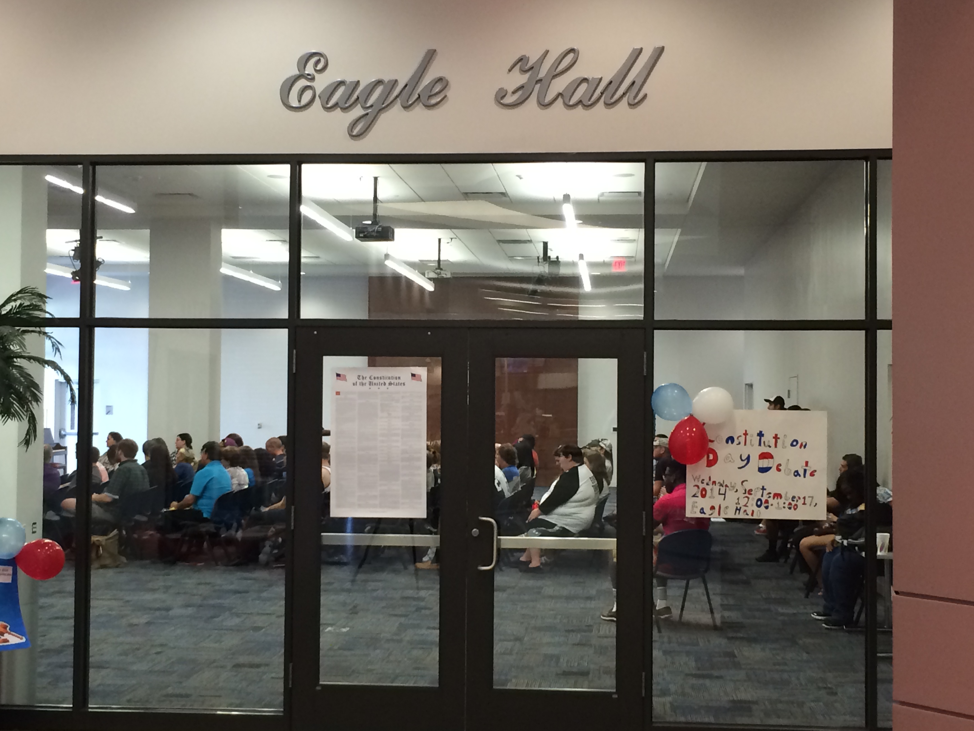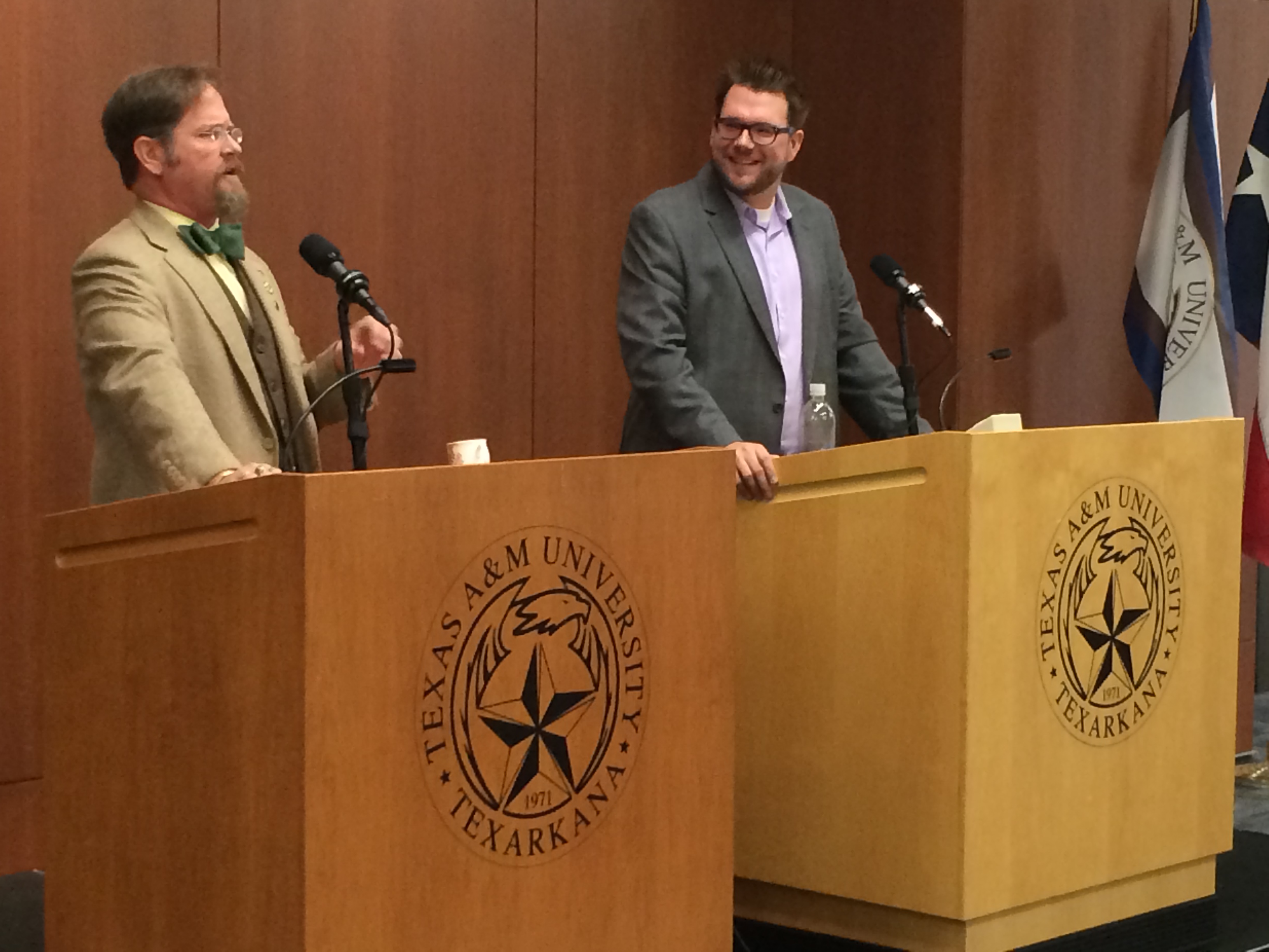 During lunch at Texas A&M-Texarkana yesterday, Dr. Drew Morton and Dr. Walter Casey debated the merits of freedom of speech and expression for Constitution Day. Dr. Morton is an Assistant Professor in the Mass Communications Department, and Dr. Casey is a Professor in the Political Science Department – both at Texas A&M-Texarkana.